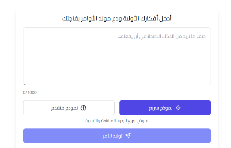 - تعتمد الأداة على الذكاء الاصطناعي لتحليل المدخلات وصياغة أمر احترافي يراعي هدفك وسياقك.